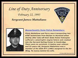 Sergeant Mattaliano was killed while conducting routine rotary wing operations in a State Police helicopter when shortly after take-off, their aircraft suffered a catastrophic engine failure resulting in a crash of the helicopter, into the roof of the Harvard Sailing Center on Memorial Drive in Cambridge. sergeant Mattaliano, a 12-year-veteran, was 33 and a member of the 65th RTT (1983) assigned to the Air Wing. He leaves behind his wife and brother.
