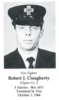 Robert J. Clougherty, 31, who came from a family of 14 in Charlestown. He was married and a father of two children. On the night of the fire, his Dad, John E. Clougherty was assistant fire chief and in charge of operations. Receiving word of his son’s death at the scene, he refused to leave until the fire was contained and the area secured. Five Boston Firefighters were killed when the front wall of a vacant 4-story toy factory, located at 34 Trumbull Street.